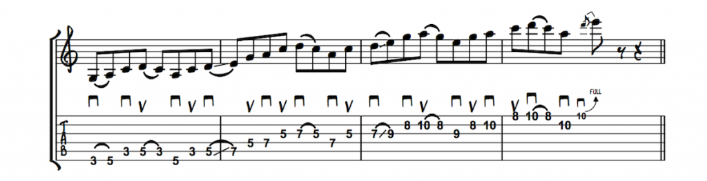 Wonderful though the above scale pattern is, eventually it becomes frustrating and limiting to always be trapped in that little four fret area. One solution is to extend out basic scale pattern a little bit lower and a little bit higher to create a nice diagonal shape that falls really naturally under the fingers.